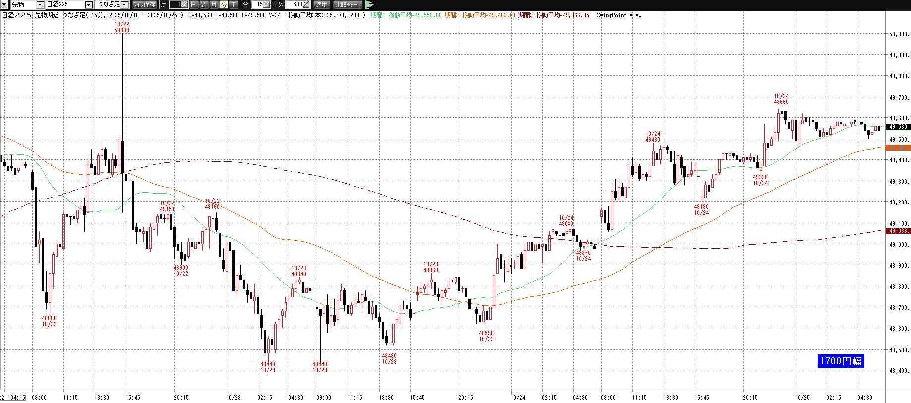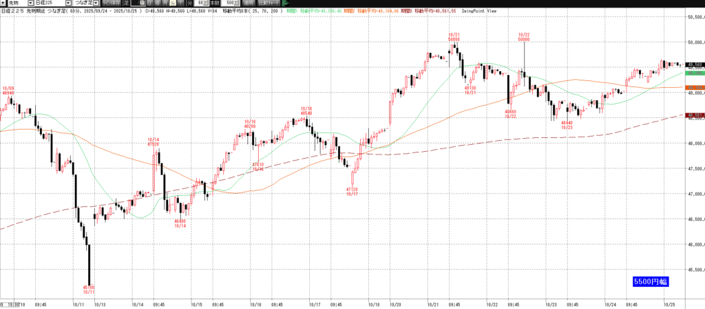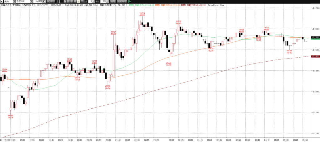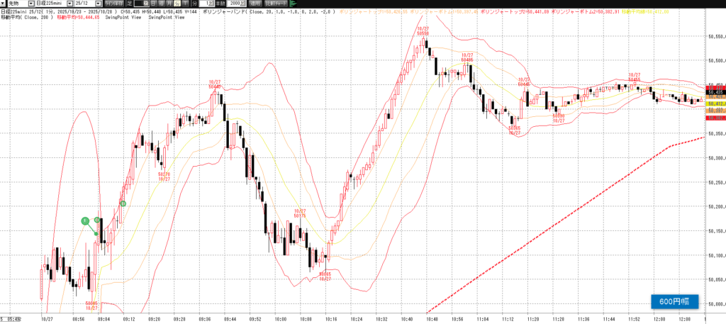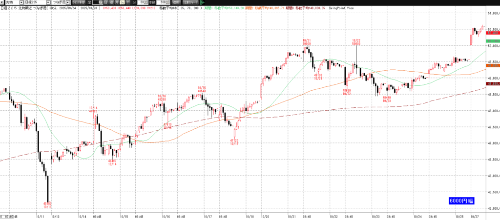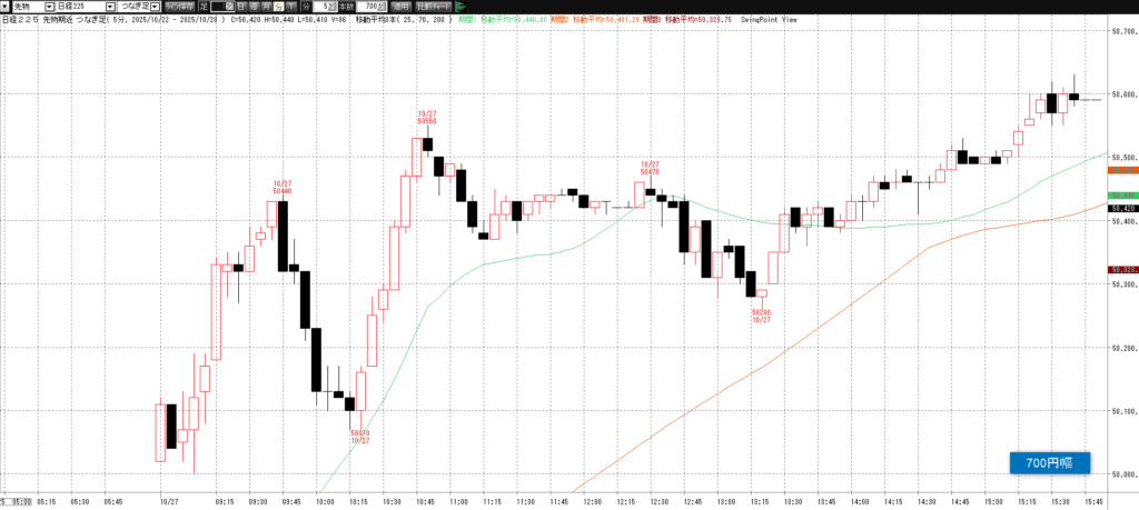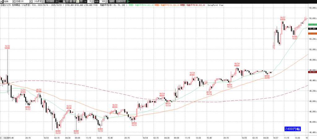 10月27日(月)トレード記録 2025.10.27 前営業日(10月24日(金)) ナイト終了後のチャート 60分足 15分足 5分足 10月27日(月) チャート 60分足 15分足 5分足 トレード結果 ノートレード スキャルピング ① 9:03 50145 買い micro2枚→ 9:03 50170 決済 micro1枚 +0.25→ 9:11 50205 決済 micro1枚 +0.6 計 +0.85