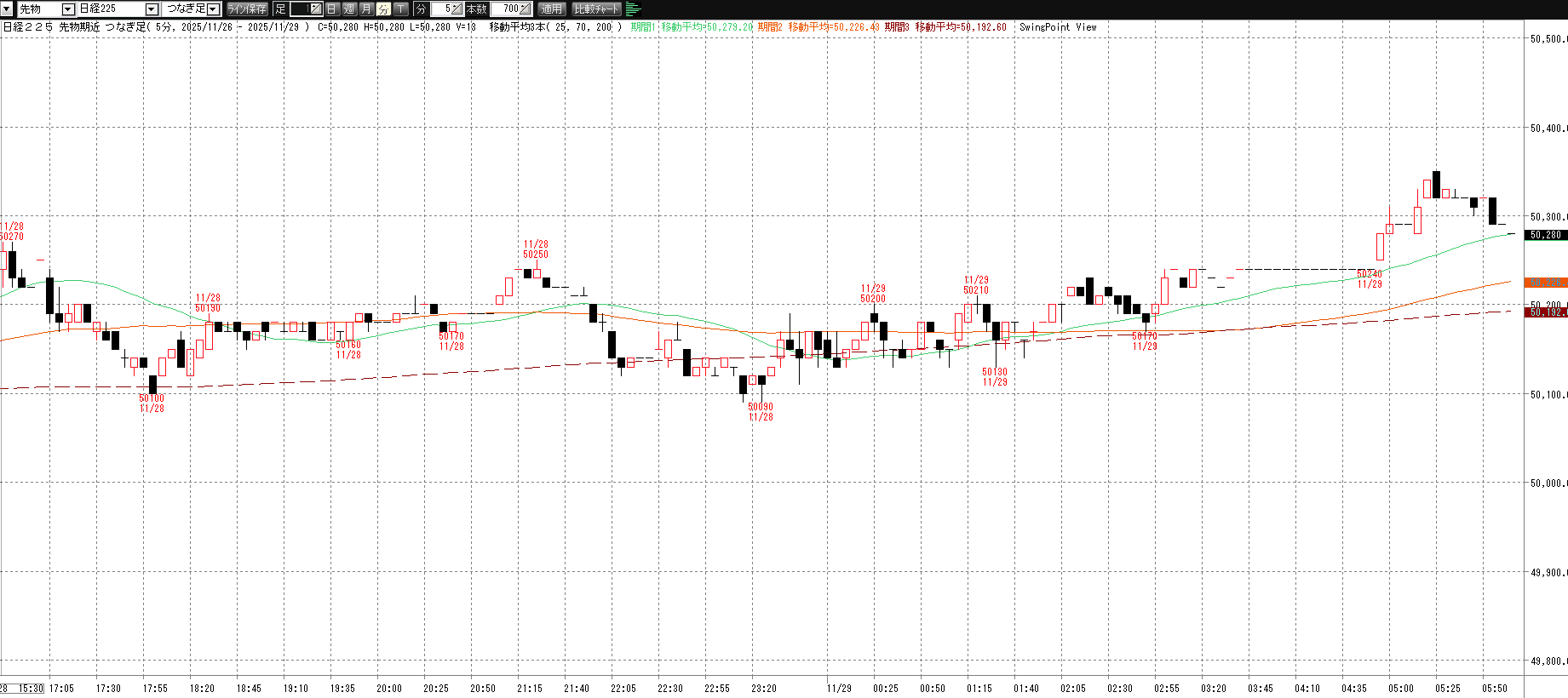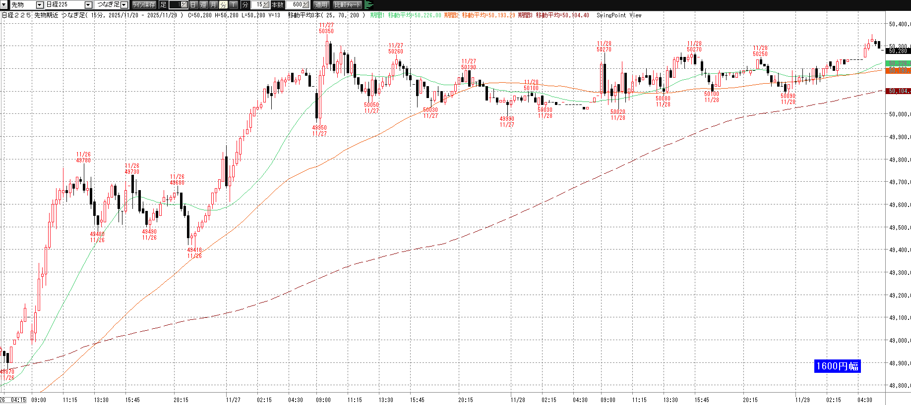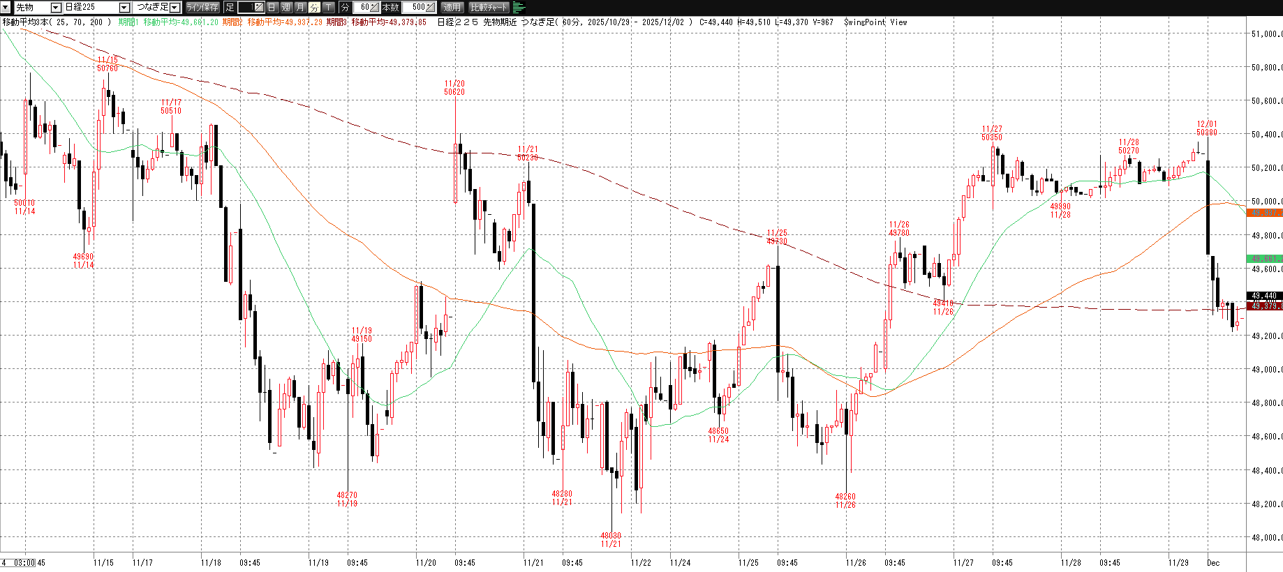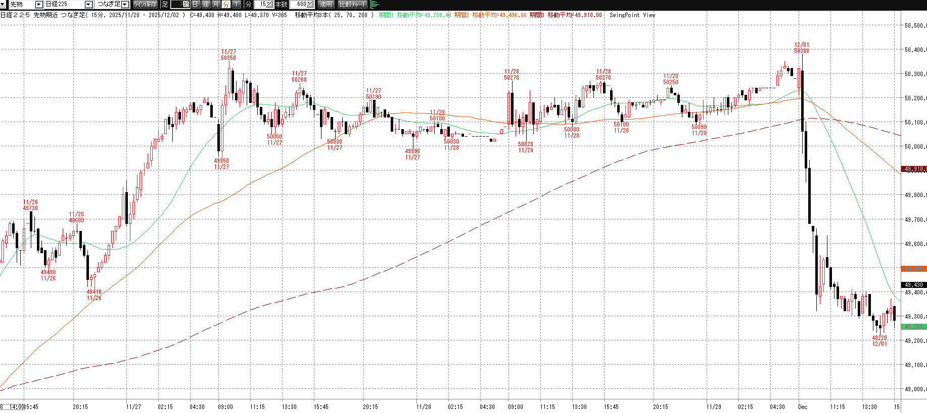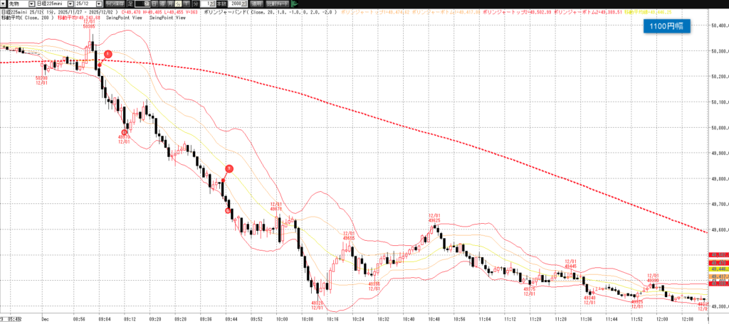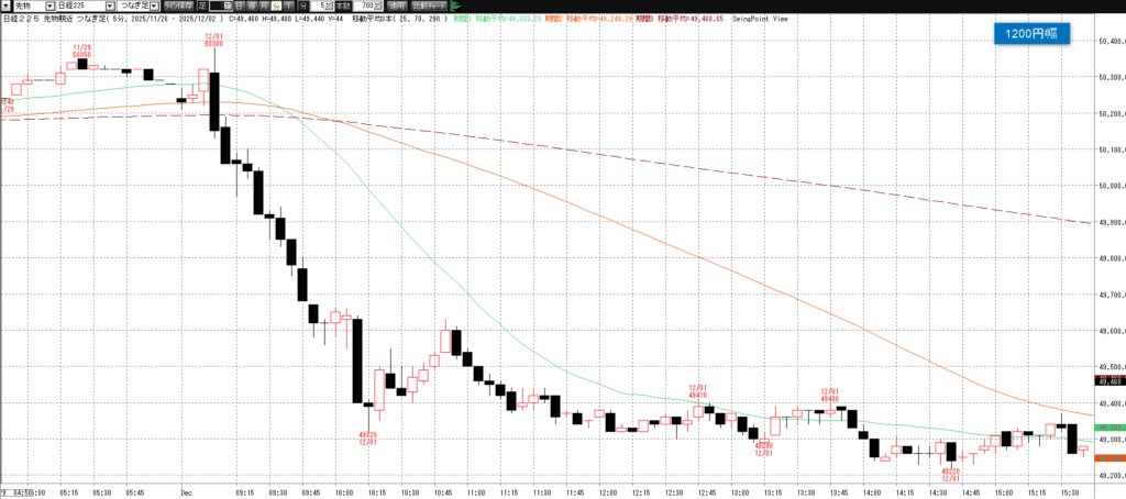 12月1日(月)トレード記録 2025.12.01 前営業日(11月28日(金)) ナイト終了後のチャート 60分足 15分足 5分足 12月1日(月) チャート 60分足 15分足 5分足 トレード結果 ノートレード スキャルピング ① 9:03 50245 買い micro2枚→ 9:11 49975 決済 micro2枚 -5.4② 9:42 49795 買い micro2枚→ 9:44 49675 決済 micro2枚 -2.4当日小計:-7.8