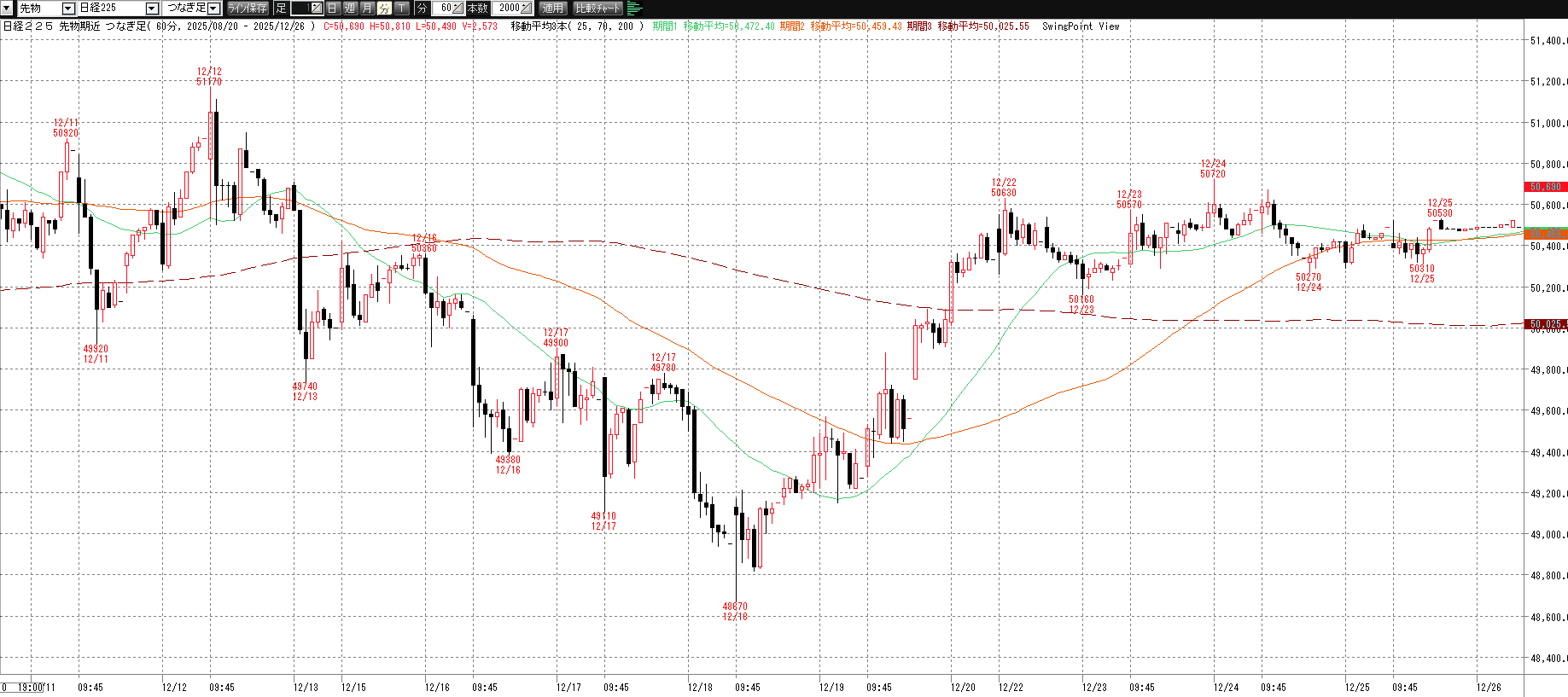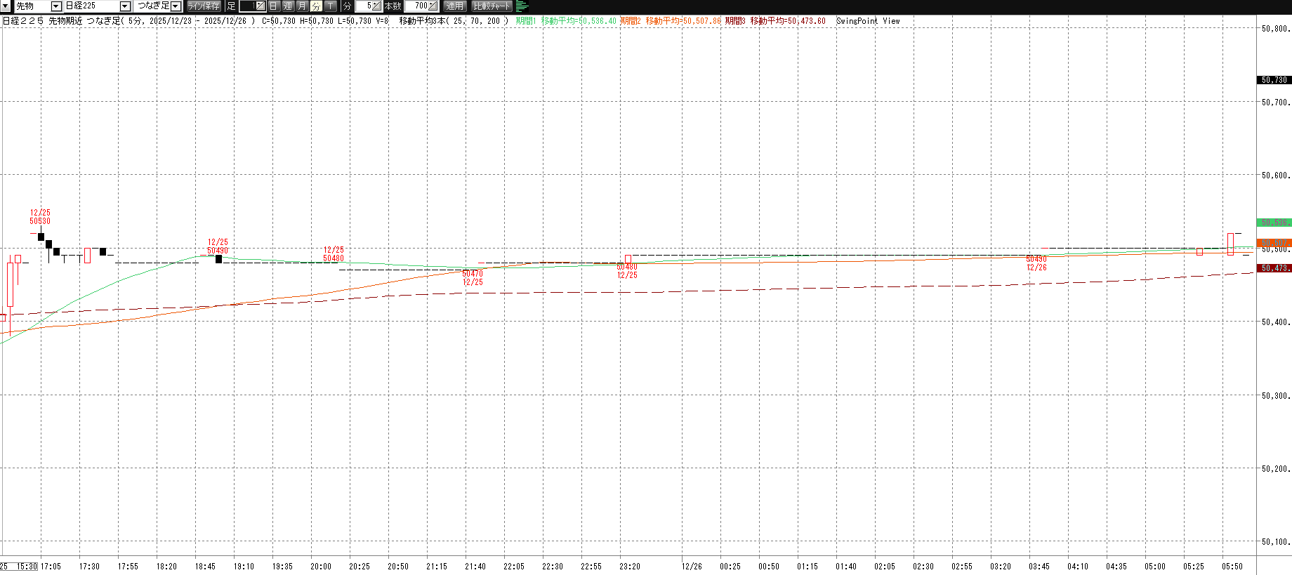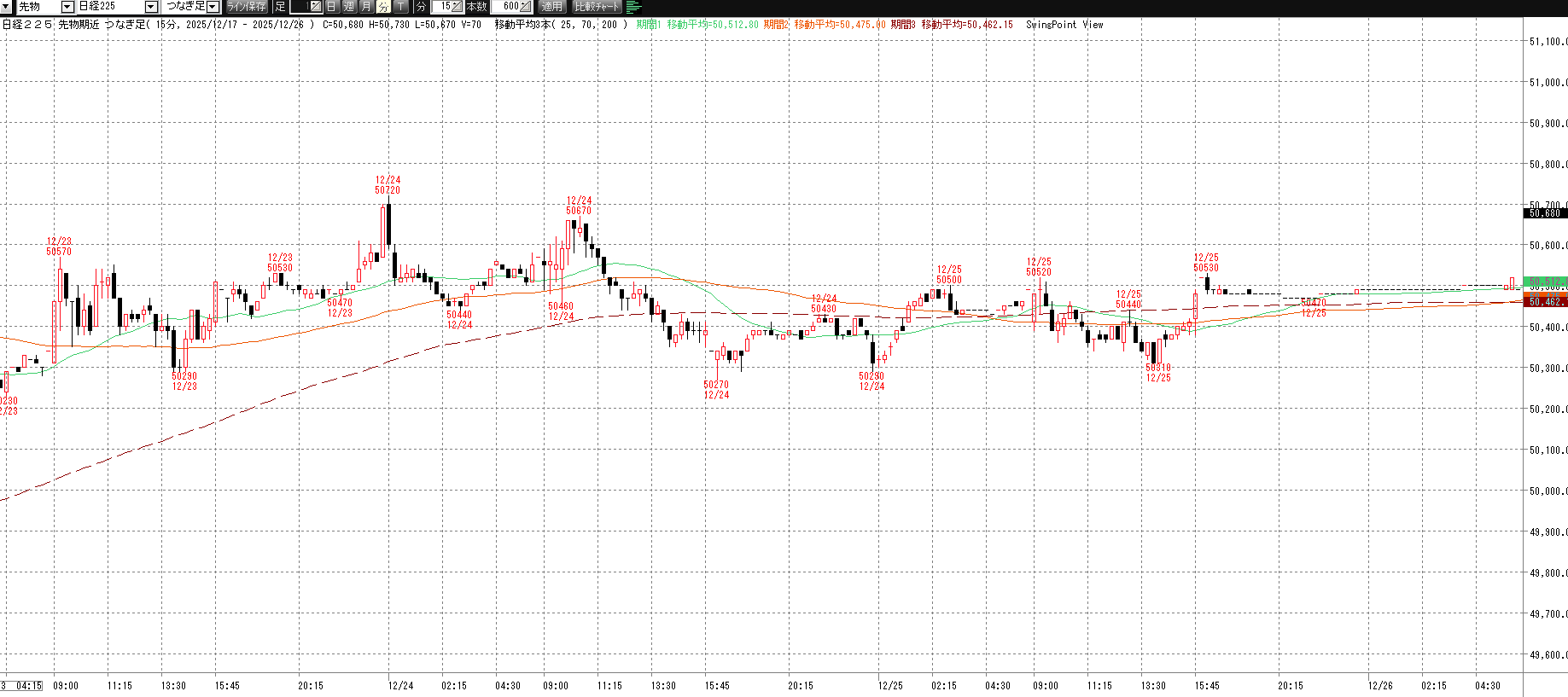12月26日(金)トレード記録 2025.12.262025.12.21 前営業日(12月25日(木)) ナイト終了後のチャート 60分足 15分足 5分足 12月26日(金) チャート 60分足 15分足 5分足 トレード結果 ノートレード スキャルピング ①10:55 50920 買い micro2枚→11:16 50950 決済 micro1枚 +0.3→11:31 50940 決済 micro1枚 +0.2 計 +0.5