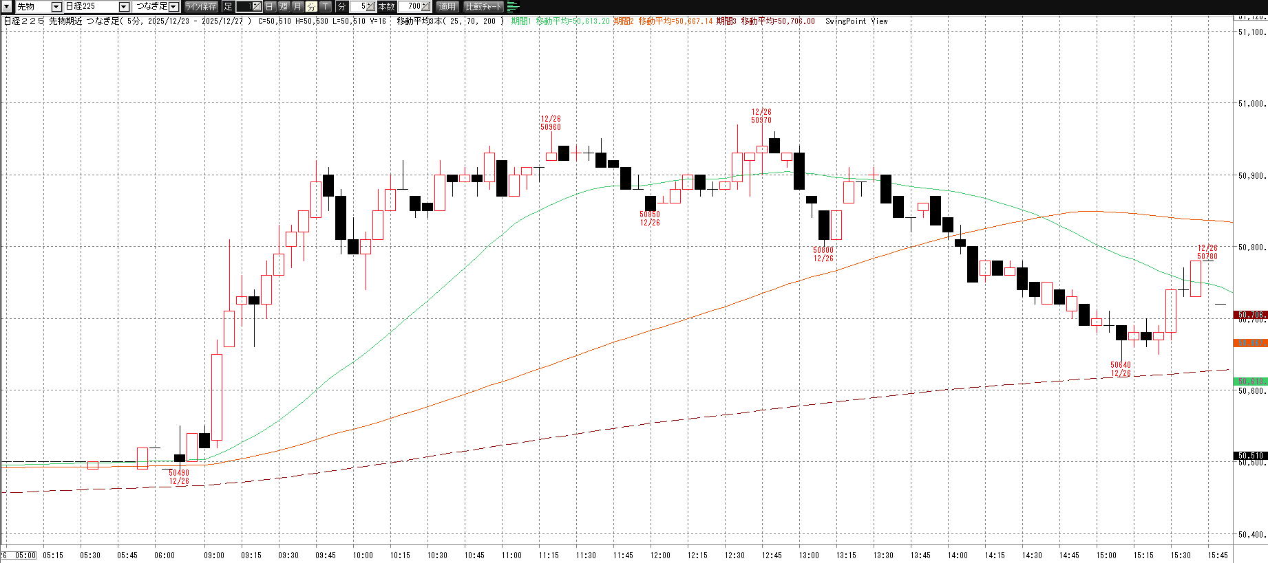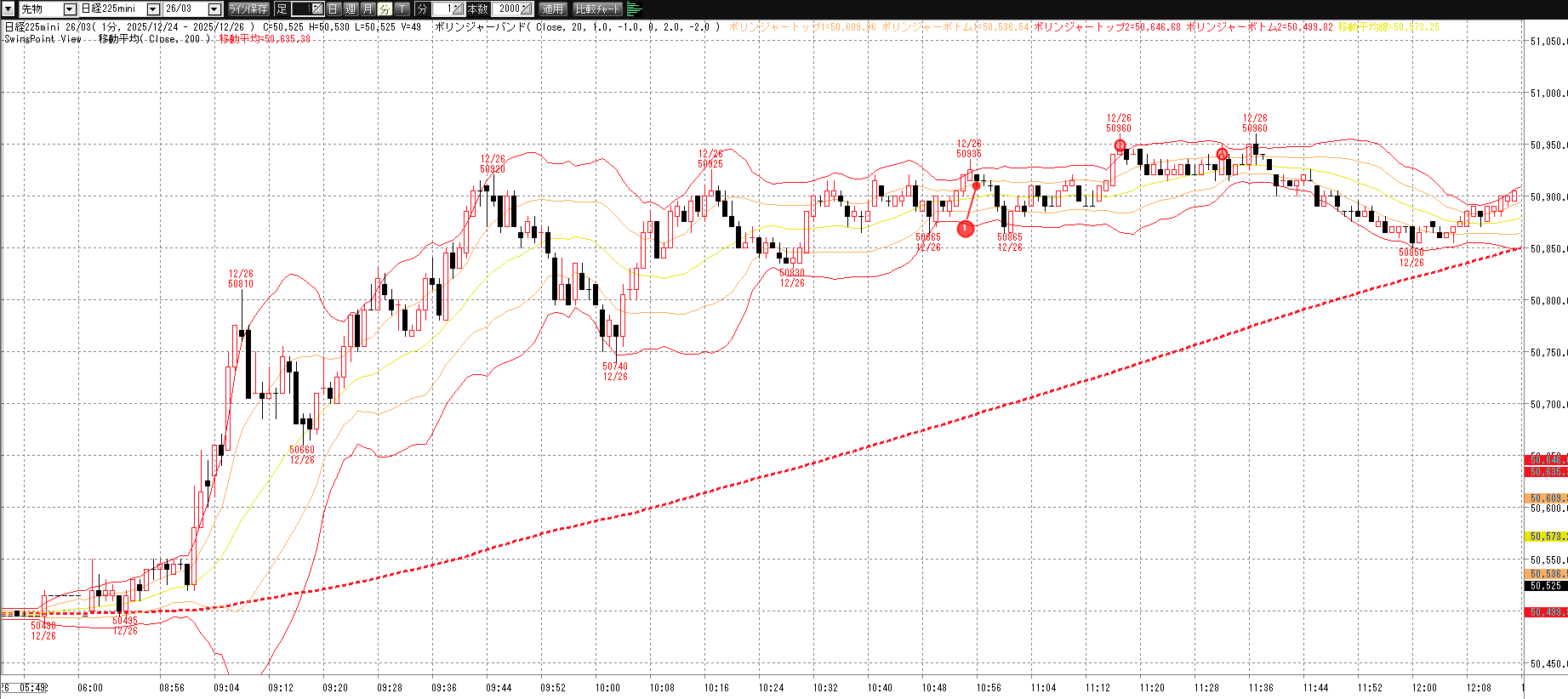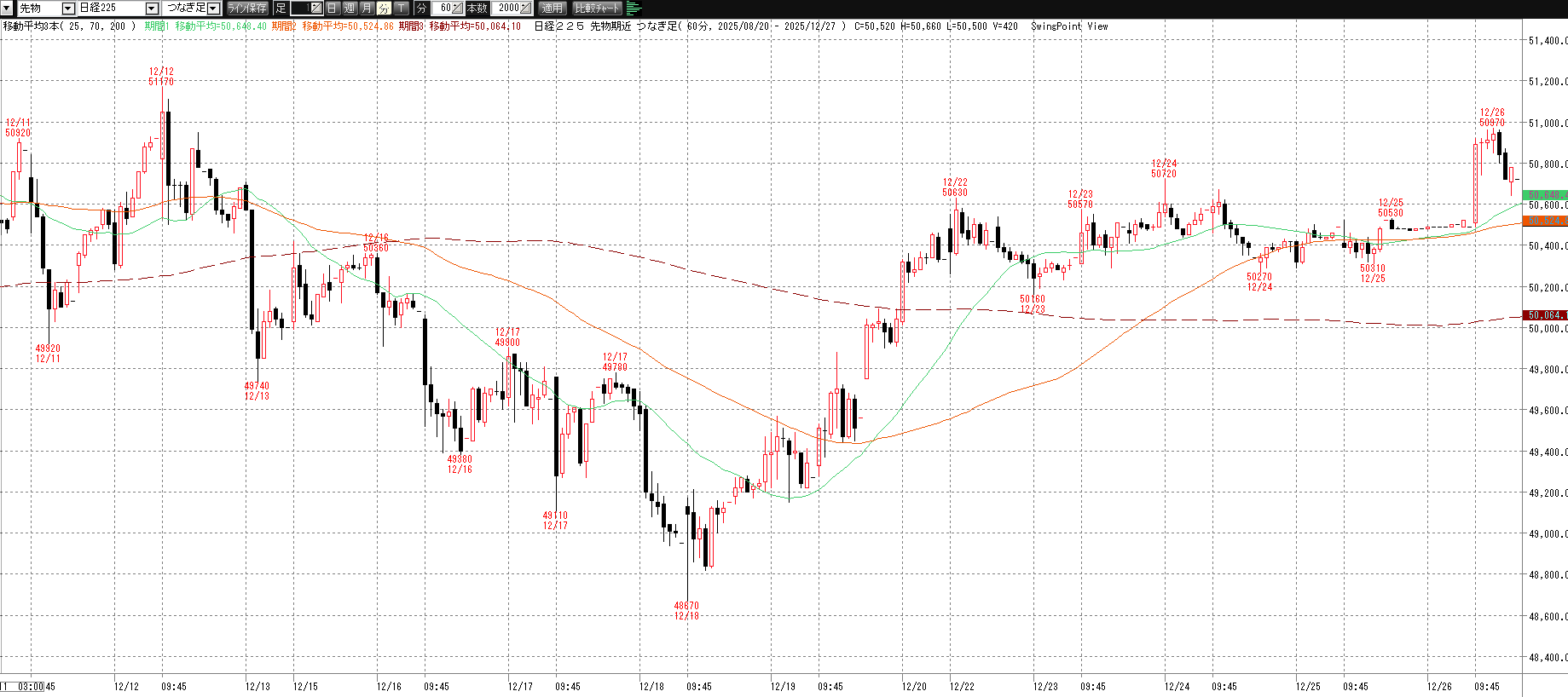 12月26日(金)トレード記録 2025.12.262025.12.21 前営業日(12月25日(木)) ナイト終了後のチャート 60分足 15分足 5分足 12月26日(金) チャート 60分足 15分足 5分足 トレード結果 ノートレード スキャルピング ①10:55 50920 買い micro2枚→11:16 50950 決済 micro1枚 +0.3→11:31 50940 決済 micro1枚 +0.2 計 +0.5